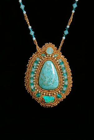 Beads of: Amazonite, Faceted Apatite, Austrian Crystal, Stick Pearl Clasp, 24K.v. Gold Seed Beads