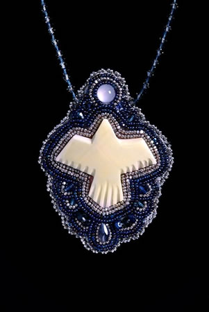 Carved Bone Bird, Blue Chalcedony Cabachon, Beads of: Faceted Iolite, Faceted Blue Sapphire, Austrian Crystal, Metal and Sterling Silver Seed Beads