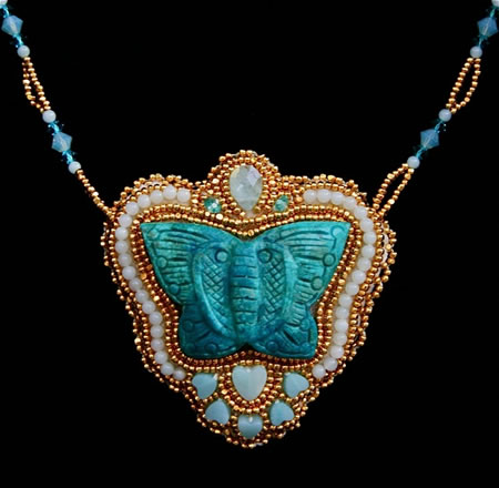 Carved Turquoise Goddess, Faceted Green Tourmaline, Austrian crystal, Faceted Austrian crystal, Metal and 24k Gold Seed Beads |